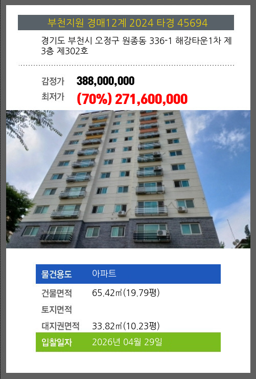 | 건물면적 | 65.42㎡ (19.79평) | 채무자 | 홍** | 최저가 | (70%) 271,600,000 |