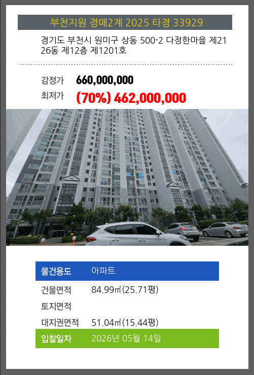 부천아파트경매 부천시 원미구 상동 500-2 다정한마을 제2126동 제12층 제1201호 №2025 타경 33929