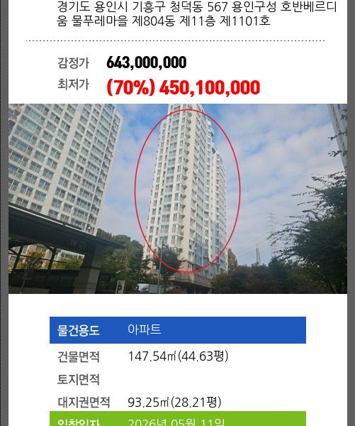 | 용도 | 아파트 | 채권자 | 홍**외1명 | 감정가 | 642,000,000 |