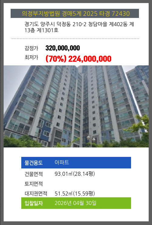 양주아파트경매 양주시 덕정동 210-2 청담마을 제402동 제13층 제1301호 №2025 타경 72430