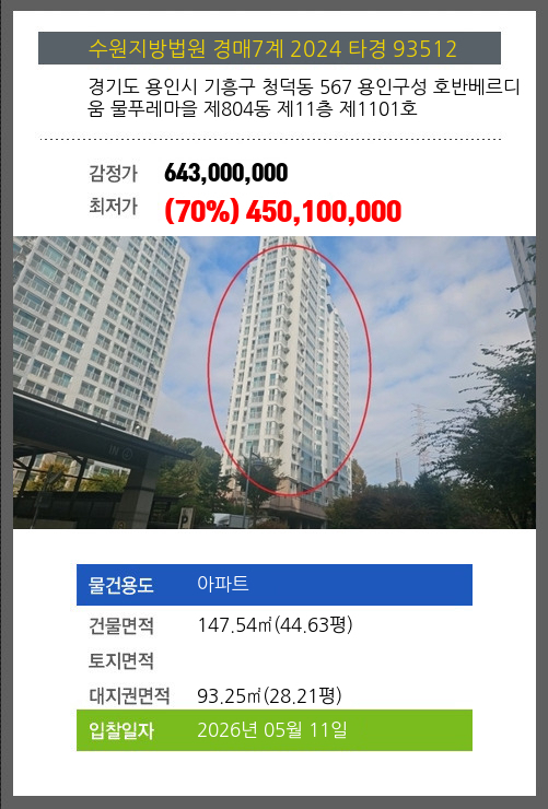 본건은 경기도 용인시 기흥구 청덕동 567 용인구성 호반베르디움 물푸레마을 제804동 제11층 제1101호