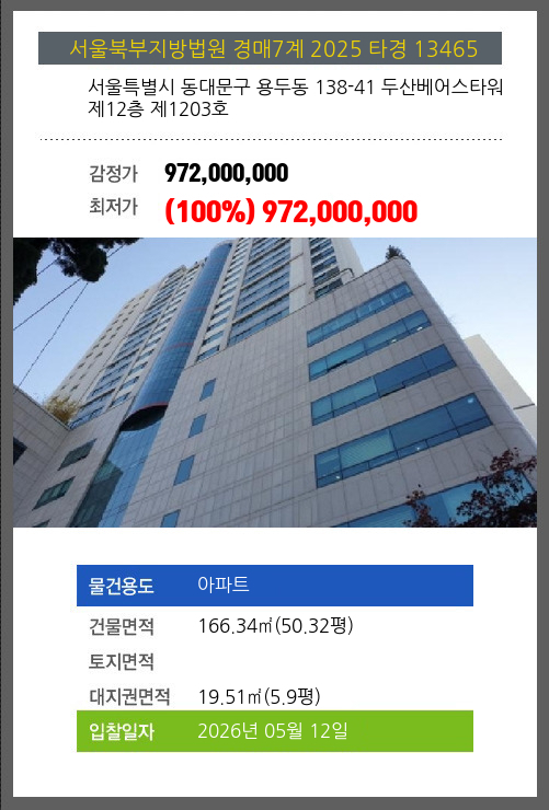 본건은 서울특별시 동대문구 용두동 138-41 두산베어스타워 제12층 제1203호