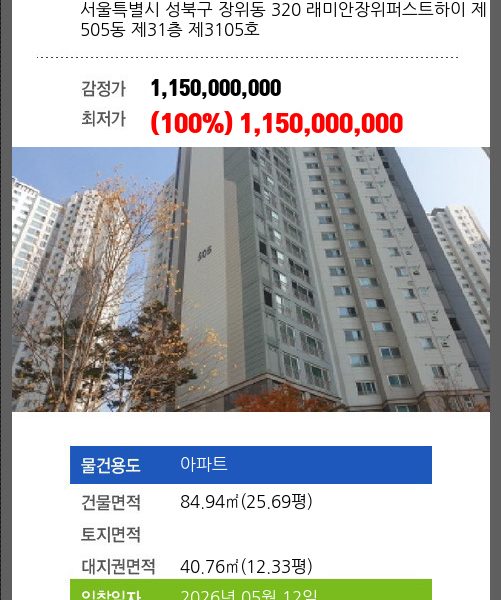 | 용도 | 아파트 | 채권자 | 제** | 감정가 | 972,000,000 |