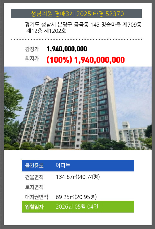 | 건물면적 | 134.67㎡ (40.74평) | 채무자 | 나** | 최저가 | (100%) 1,940,000,000 |