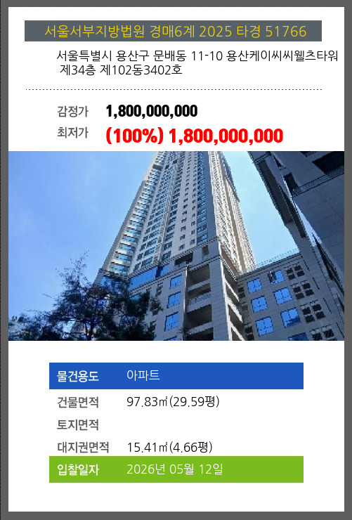 용산아파트경매 용산구 문배동 11-10 용산케이씨씨웰츠타워 제34층 제102동3402호 №2025 타경 51766