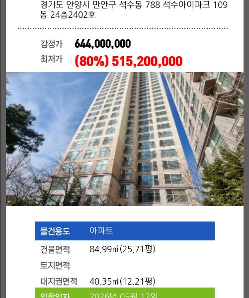 | 건물면적 | 84.76㎡ (25.64평) | 채무자 | 김** | 최저가 | (100%) 949,000,000 |