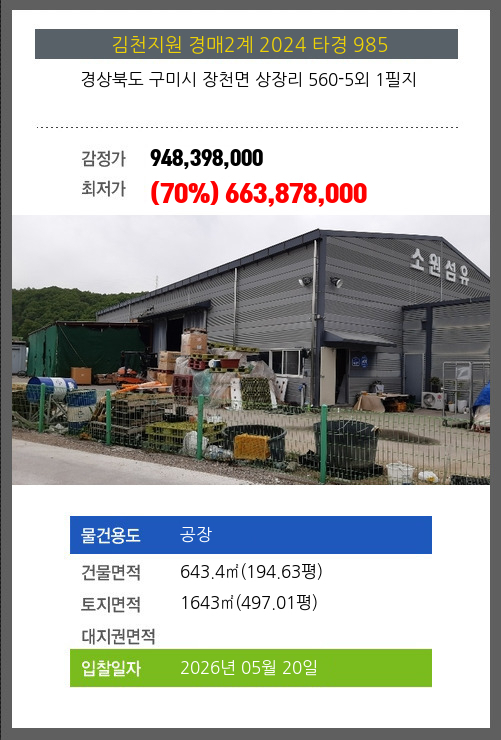 | 소재지 | [지번] 경상북도 구미시 장천면 상장리 560-5외 1필지 [도로명 주소] 경상북도 구미시 장천면 송신로 487외 1필지 |