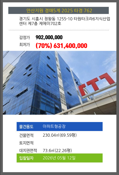 본건은 경기도 시흥시 정왕동 1255-10 타원타크라6지식산업센터 제7층 제에이702호