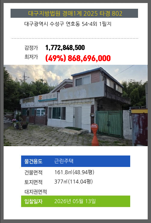 | 소재지 | [지번] 대구광역시 수성구 연호동 54-4외 1필지 [도로명 주소] 대구광역시 수성구 달구벌대로 2877-5외 1필지 |