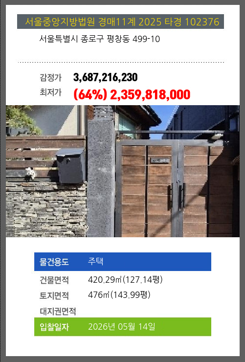 종로주택경매 종로구 평창동 499-10 №2025 타경 102376