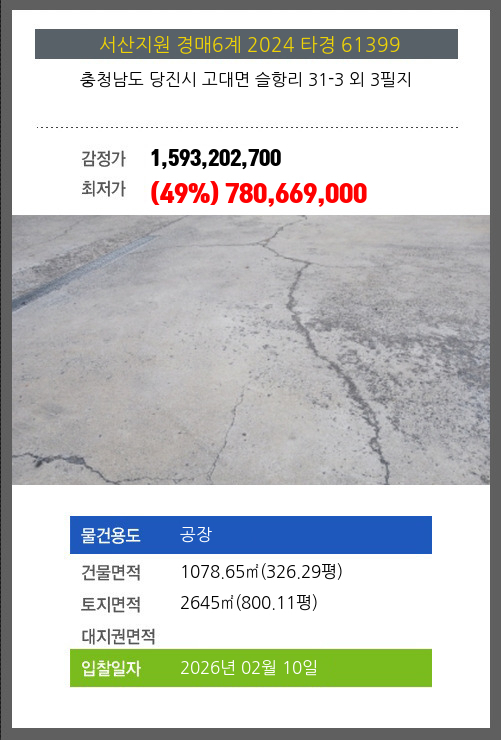 사건번호 2024 타경 61399 본건은 충청남도 당진시 고대면 슬항리 31-3 외 3필지소재하는 공장경매 물건의 포스팅입니다. 건물면적 [ 1078.65㎡ (326.29평) ]토지면적 [ 2645㎡ (800.11평) ] 시세를