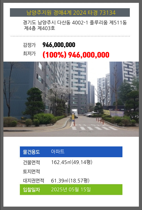 사건번호 2024 타경 73134 본건은 경기도 남양주시 다산동 4002-1 플루리움 제511동 제4층 제403호소재하는 아파트경매 물건의 포스팅입니다. 건물면적 [ 162.45㎡ (49.14평) ]대지권 [ 61.39㎡ (18.57평) ]