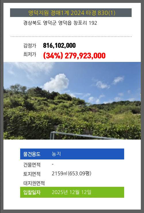 사건번호 2024 타경 830(1) 본건은 경상북도 영덕군 영덕읍 창포리 192소재하는 농지경매 물건의 포스팅입니다. 토지면적 [ 2159㎡ (653.09평) ] 시세를 반영한 감정가 816,102,000에서3회 유찰되어 감정가 대비