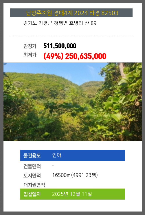 사건번호 2024 타경 82503 본건은 경기도 가평군 청평면 호명리 산 89소재하는 임야경매 물건의 포스팅입니다. 토지면적 [ 16500㎡ (4991.23평) ] 시세를 반영한 감정가 511,500,000에서2회 유찰되어 감정가