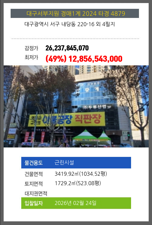 사건번호 2024 타경 4879 본건은 대구광역시 서구 내당동 220-16 외 4필지소재하는 근린시설경매 물건의 포스팅입니다. 건물면적 [ 3419.92㎡ (1034.52평) ]토지면적 [ 1729.2㎡ (523.08평) ] 시세를 반영한