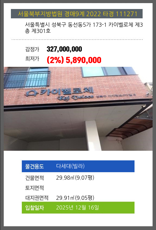 사건번호 2022 타경 111271 본건은 서울특별시 성북구 동선동5가 173-1 카이벨로체 제3층 제301호소재하는 다세대(빌라)경매 물건의 포스팅입니다. 건물면적 [ 29.98㎡ (9.07평) ]대지권 [ 29.91㎡ (9.05평) ] 시세를