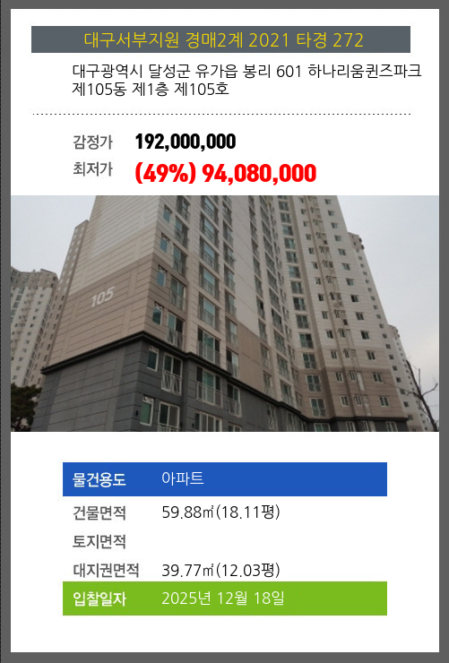 사건번호 2021 타경 272 본건은 대구광역시 달성군 유가읍 봉리 601 하나리움퀸즈파크 제105동 제1층 제105호소재하는 아파트경매 물건의 포스팅입니다. 건물면적 [ 59.88㎡ (18.11평) ]대지권 [ 39.77㎡ (12.03평)