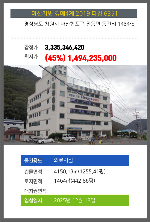 사건번호 2019 타경 6351 본건은 경상남도 창원시 마산합포구 진동면 동전리 1434-5소재하는 의료시설경매 물건의 포스팅입니다. 건물면적 [ 4150.13㎡ (1255.41평) ]토지면적 [ 1464㎡ (442.86평) ] 시세를 반영한