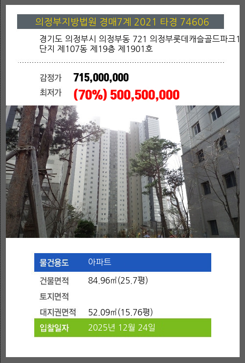 사건번호 2021 타경 74606 본건은 경기도 의정부시 의정부동 721 의정부롯데캐슬골드파크1단지 제107동 제19층 제1901호소재하는 아파트경매 물건의 포스팅입니다. 건물면적 [ 84.96㎡ (25.7평) ]대지권 [ 52.09㎡ (15.76평) ]