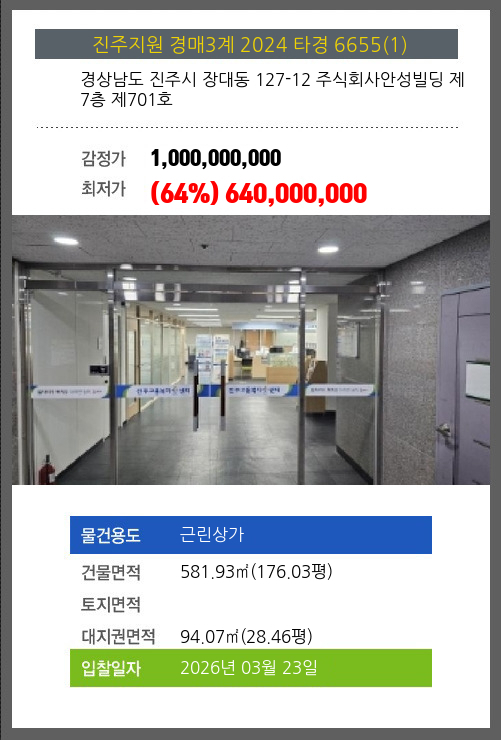 사건번호 2024 타경 6655(1) 본건은 경상남도 진주시 장대동 127-12 주식회사안성빌딩 제7층 제701호소재하는 근린상가경매 물건의 포스팅입니다. 건물면적 [ 581.93㎡ (176.03평) ]대지권 [ 94.07㎡ (28.46평) ] 시세를