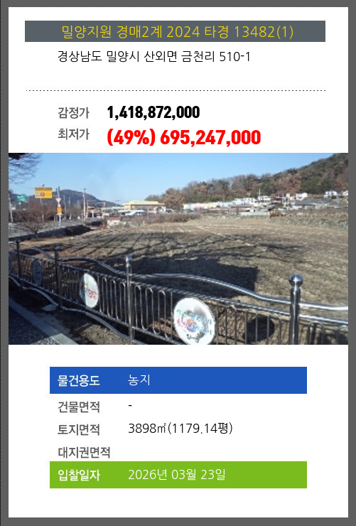 사건번호 2024 타경 13482(1) 본건은 경상남도 밀양시 산외면 금천리 510-1소재하는 농지경매 물건의 포스팅입니다. 토지면적 [ 3898㎡ (1179.14평) ] 시세를 반영한 감정가 1,418,872,000에서2회 유찰되어 감정가 대비