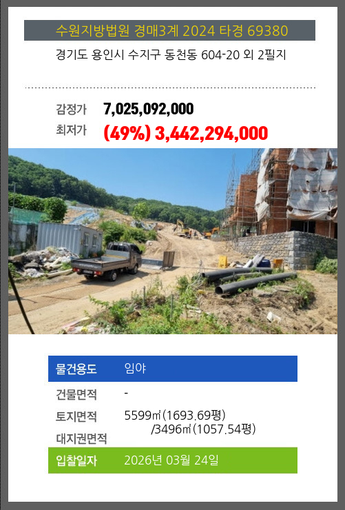 사건번호 2024 타경 69380 본건은 경기도 용인시 수지구 동천동 604-20 외 2필지소재하는 임야경매 물건의 포스팅입니다. 토지면적 [ 전체:5599㎡ (1693.69평) 매각지분:3496㎡ (1057.54평) ] 시세를 반영한 감정가