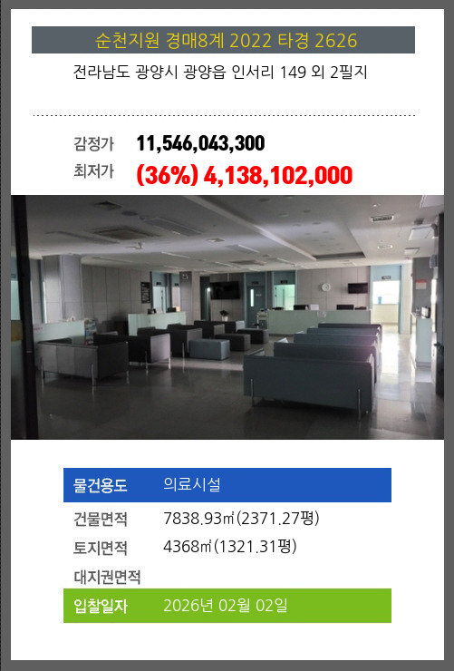 사건번호 2022 타경 2626 본건은 전라남도 광양시 광양읍 인서리 149 외 2필지소재하는 의료시설경매 물건의 포스팅입니다. 건물면적 [ 7838.93㎡ (2371.27평) ]토지면적 [ 4368㎡ (1321.31평) ] 시세를