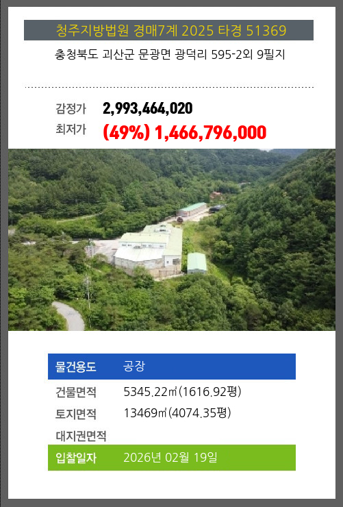 사건번호 2025 타경 51369 본건은 충청북도 괴산군 문광면 광덕리 595-2외 9필지소재하는 공장경매 물건의 포스팅입니다. 건물면적 [ 5345.22㎡ (1616.92평) ]토지면적 [ 13469㎡ (4074.35평) ] 시세를 반영한