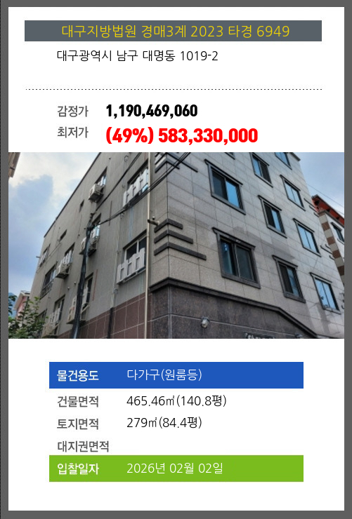 사건번호 2023 타경 6949 본건은 대구광역시 남구 대명동 1019-2소재하는 다가구(원룸등)경매 물건의 포스팅입니다. 건물면적 [ 465.46㎡ (140.8평) ]토지면적 [ 279㎡ (84.4평) ] 시세를 반영한 감정가 1,190,469,060에서2회