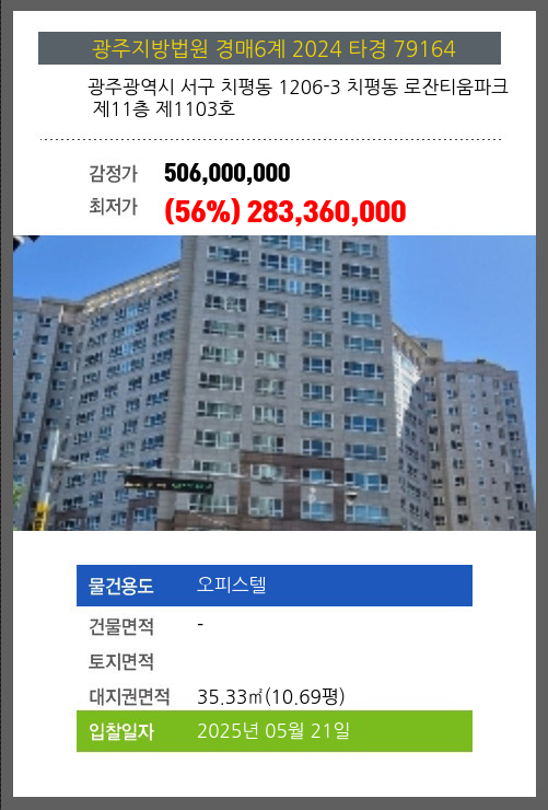 사건번호 2025 타경 32633 본건은 광주광역시 서구 마륵동 1 상무자이아파트 제104동 제1층 제103호소재하는 아파트경매 물건의 포스팅입니다. 건물면적 [ 210.84㎡ (63.78평) ]대지권 [ 138.72㎡ (41.96평) ]