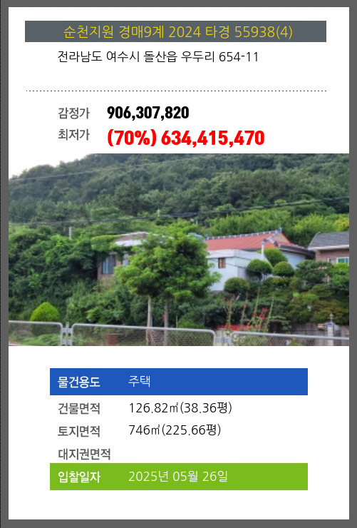 사건번호 2024 타경 2439(1) 본건은 전라남도 여수시 문수동 243 1동외 30필지소재하는 문화및집회시설경매 물건의 포스팅입니다. 건물면적 [ 4133.65㎡ (1250.42평) ]토지면적 [ 전체:13512㎡ (4087.36평) 매각지분:13458.25㎡ (4071.1평) ]