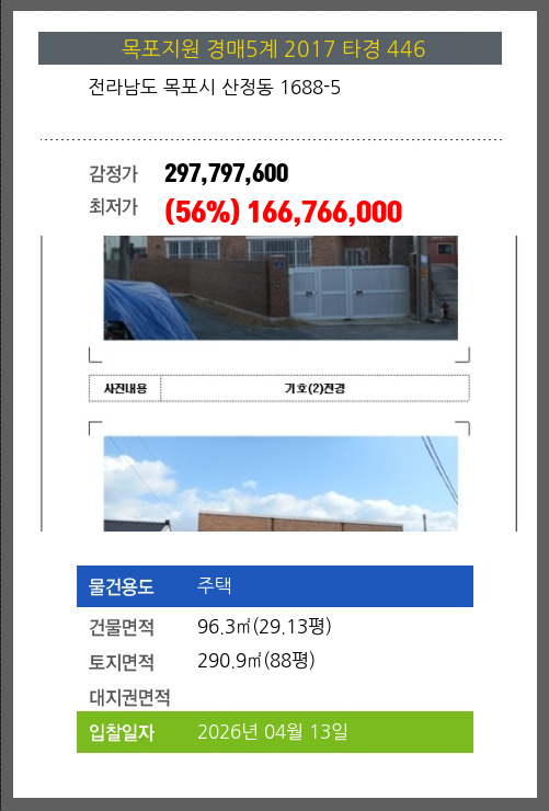 사건번호 2017 타경 446 본건은 전라남도 목포시 산정동 1688-5소재하는 주택경매 물건의 포스팅입니다. 건물면적 [ 96.3㎡ (29.13평) ]토지면적 [ 290.9㎡ (88평) ] 시세를 반영한 감정가 297,797,600에서2회