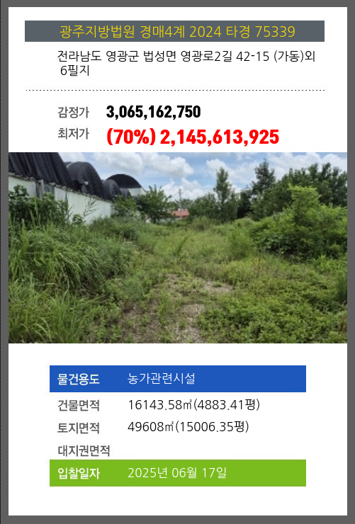 사건번호 2024 타경 75339 본건은 전라남도 영광군 법성면 영광로2길 42-15 (가동)외 6필지소재하는 농가관련시설경매 물건의 포스팅입니다. 건물면적 [ 16143.58㎡ (4883.41평) ]토지면적 [ 49608㎡ (15006.35평) ] 시세를