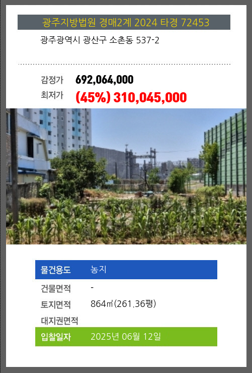 사건번호 2024 타경 72453 본건은 광주광역시 광산구 소촌동 537-2소재하는 농지경매 물건의 포스팅입니다. 토지면적 [ 864㎡ (261.36평) ] 시세를 반영한 감정가 692,064,000에서3회 유찰되어 감정가 대비 45%최저가