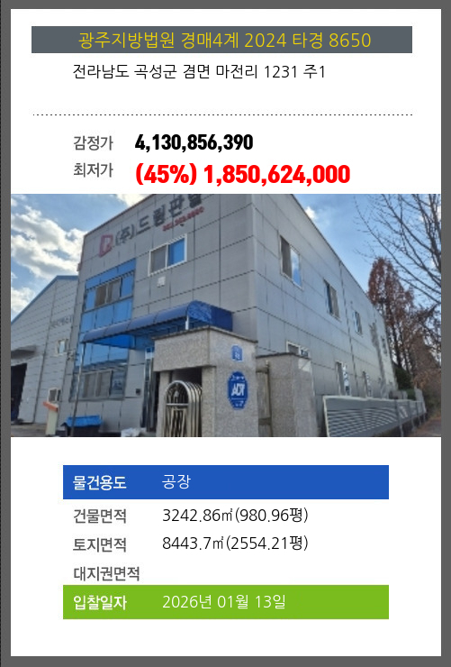 사건번호 2024 타경 8650 본건은 전라남도 곡성군 겸면 마전리 1231 주1소재하는 공장경매 물건의 포스팅입니다. 건물면적 [ 3242.86㎡ (980.96평) ]토지면적 [ 8443.7㎡ (2554.21평) ] 시세를 반영한