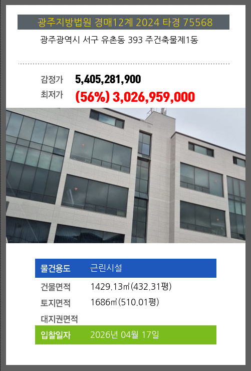 사건번호 2024 타경 75568 본건은 광주광역시 서구 유촌동 393 주건축물제1동소재하는 근린시설경매 물건의 포스팅입니다. 건물면적 [ 1429.13㎡ (432.31평) ]토지면적 [ 1686㎡ (510.01평) ] 시세를 반영한 감정가