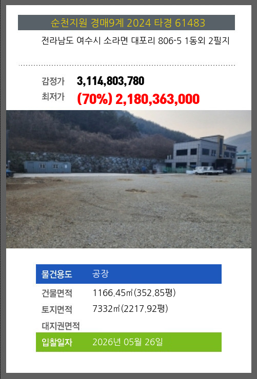 사건번호 2024 타경 61483 본건은 전라남도 여수시 소라면 대포리 806-5 1동외 2필지소재하는 근린시설경매 물건의 포스팅입니다. 토지면적 [ 7332㎡ (2217.92평) ] 시세를 반영한 감정가 3,114,803,780에서신건으로 감정가
