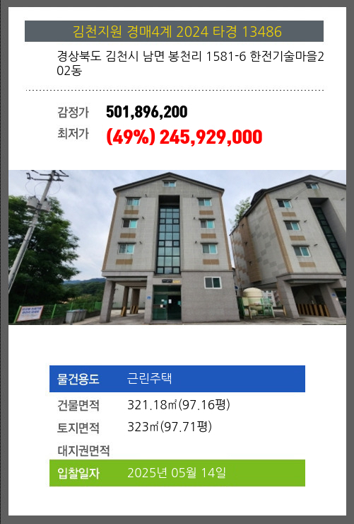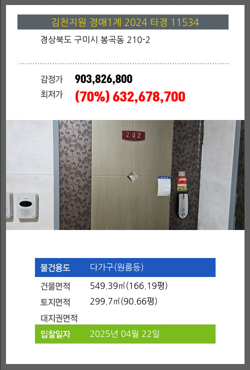 사건번호 2024 타경 16843 본건은 경상북도 구미시 광평동 491외 1필지소재하는 다가구(원룸등)경매 물건의 포스팅입니다. 건물면적 [ 632.64㎡ (191.37평) ]토지면적 [ 351㎡ (106.18평) ] 시세를 반영한 감정가