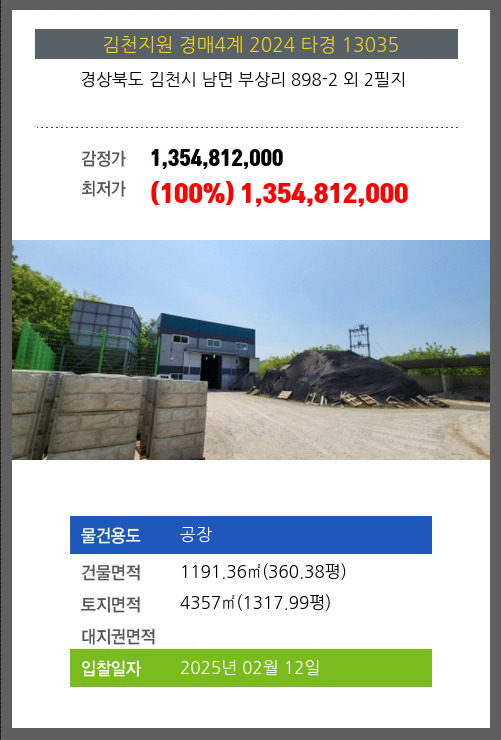 사건번호 2023 타경 1073 본건은 경상북도 김천시 어모면 남산리 2016소재하는 공장용지경매 물건의 포스팅입니다. 건물면적 [ 토지만매각 ]토지면적 [ 31890.7㎡ (9646.89평) ] 시세를 반영한 감정가 6,665,156,300에서1회