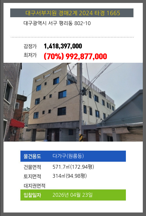 사건번호 2024 타경 1665 본건은 대구광역시 서구 평리동 802-10소재하는 다가구(원룸등)경매 물건의 포스팅입니다. 건물면적 [ 571.7㎡ (172.94평) ]토지면적 [ 314㎡ (94.98평) ] 시세를 반영한 감정가 1,418,397,000에서3회