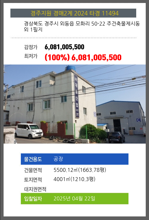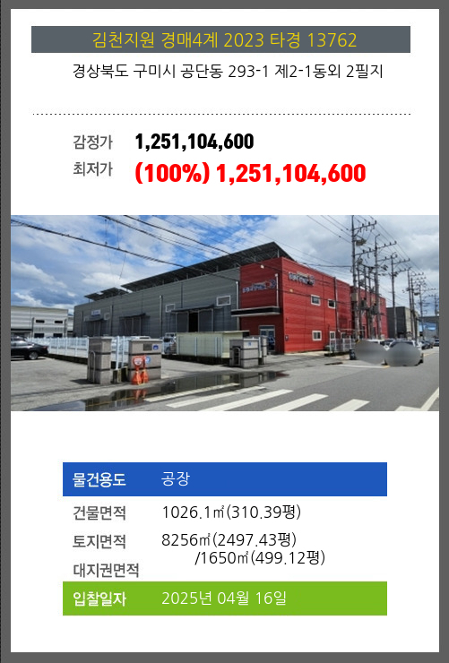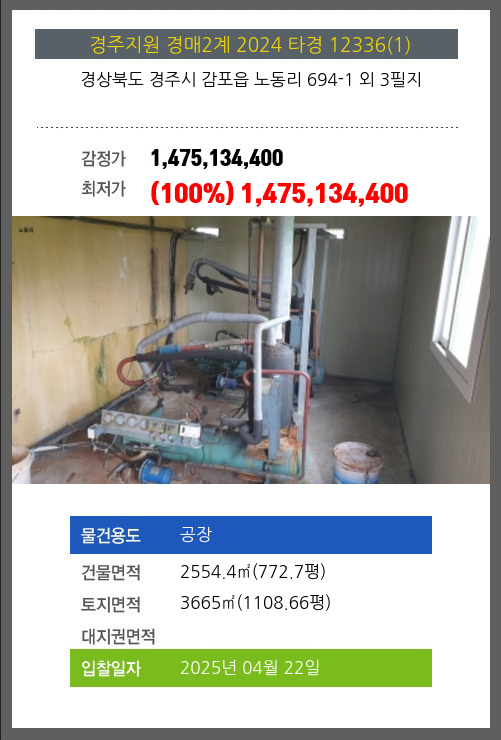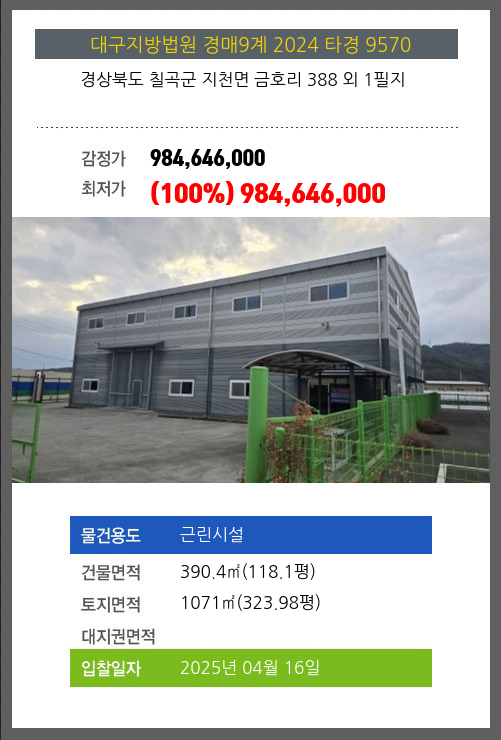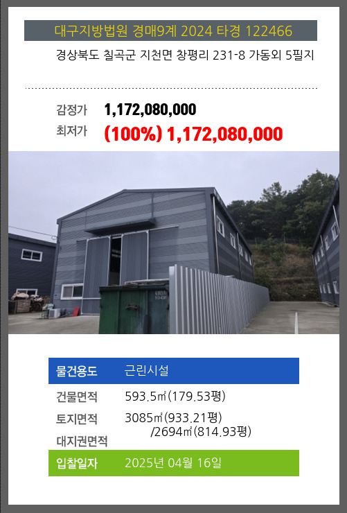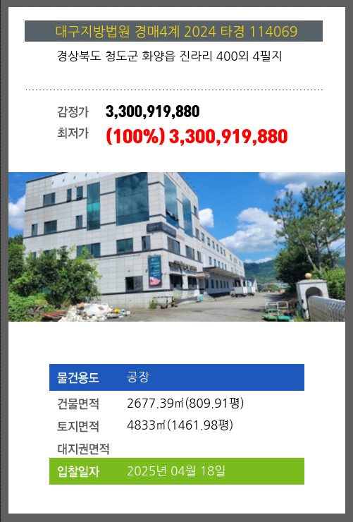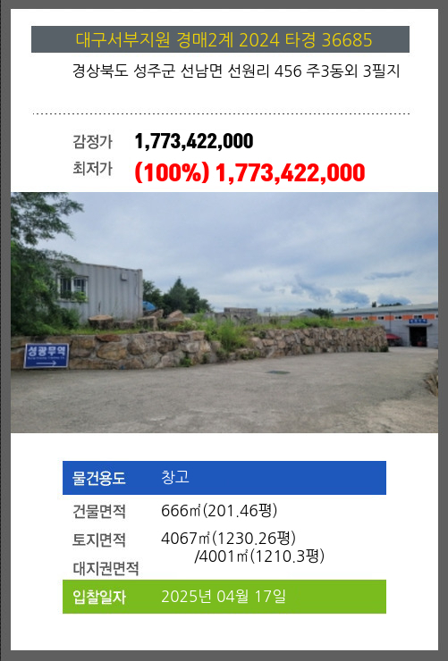 사건번호 2025 타경 30660 본건은 경상북도 성주군 선남면 도성리 486 외 3필지소재하는 공장경매 물건의 포스팅입니다. 건물면적 [ 582.15㎡ (176.1평) ]토지면적 [ 2314㎡ (699.98평) ] 시세를
