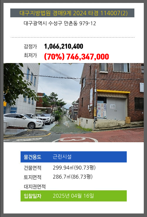 사건번호 2024 타경 128846 본건은 대구광역시 남구 대명동 1698-15소재하는 근린주택경매 물건의 포스팅입니다. 건물면적 [ 425.75㎡ (128.79평) ]토지면적 [ 221.4㎡ (66.97평) ] 시세를 반영한 감정가 1,069,832,320에서2회