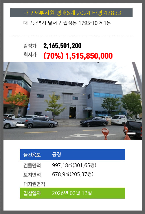 사건번호 2024 타경 42833 본건은 대구광역시 달서구 월성동 1795-10 제1동소재하는 공장경매 물건의 포스팅입니다. 건물면적 [ 997.18㎡ (301.65평) ]토지면적 [ 678.9㎡ (205.37평) ] 시세를 반영한 감정가