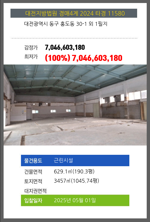 사건번호 2025 타경 502786 본건은 대전광역시 유성구 신동 662-10 피에이치에스연구소연구에이동소재하는 공장경매 물건의 포스팅입니다. 건물면적 [ 1902.18㎡ (575.41평) ]토지면적 [ 4185.9㎡ (1266.23평) ] 시세를 반영한 감정가
