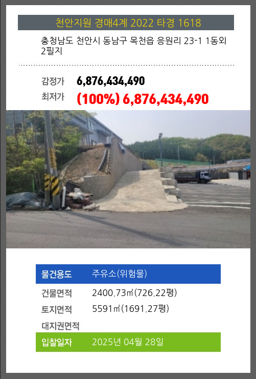 사건번호 2025 타경 377 본건은 충청남도 천안시 동남구 광덕면 행정리 5 외 7필지소재하는 농지경매 물건의 포스팅입니다. 토지면적 [ 4261㎡ (1288.95평) ] 시세를 반영한 감정가 1,755,532,000에서3회