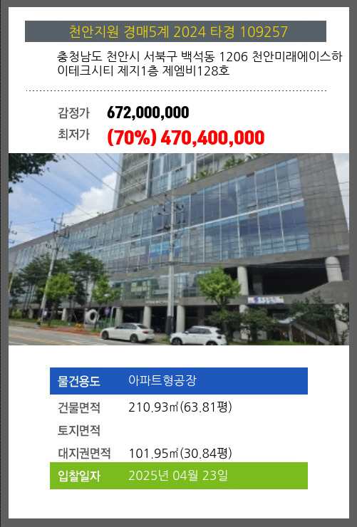 사건번호 2025 타경 15578 본건은 충청남도 예산군 삽교읍 효림리 508 공장동소재하는 공장경매 물건의 포스팅입니다. 건물면적 [ 3033.8㎡ (917.72평) ]토지면적 [ 9917.4㎡ (3000평) ] 시세를 반영한