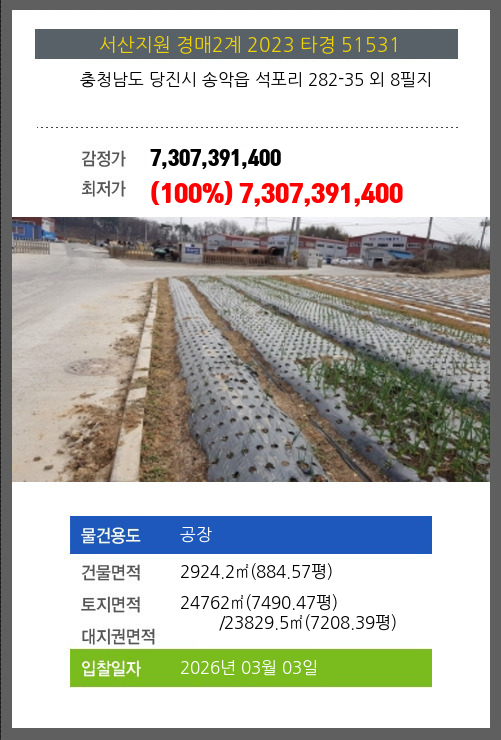 사건번호 2023 타경 51531 본건은 충청남도 당진시 송악읍 석포리 282-35 외 8필지소재하는 공장경매 물건의 포스팅입니다. 건물면적 [ 2924.2㎡ (884.57평) ]토지면적 [ 전체:24762㎡ (7490.47평) 매각지분:23829.5㎡ (7208.39평)