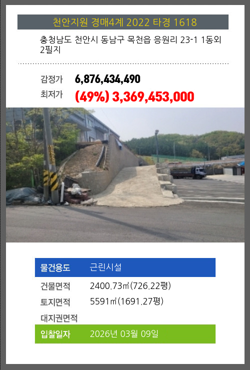 사건번호 2022 타경 1618 본건은 충청남도 천안시 동남구 목천읍 응원리 23-1 1동외 2필지소재하는 근린시설경매 물건의 포스팅입니다. 건물면적 [ 2400.73㎡ (726.22평) ]토지면적 [ 5591㎡ (1691.27평) ]
