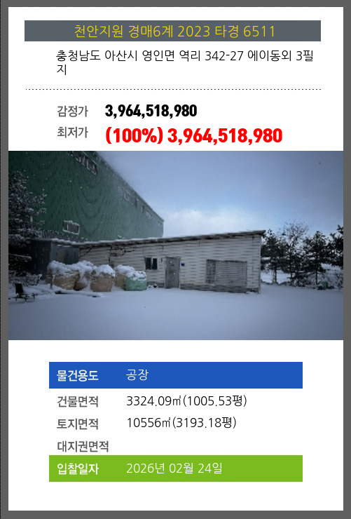 사건번호 2023 타경 6511 본건은 충청남도 아산시 영인면 역리 342-27 에이동외 3필지소재하는 공장경매 물건의 포스팅입니다. 건물면적 [ 3324.09㎡ (1005.53평) ]토지면적 [ 10556㎡ (3193.18평) ] 시세를