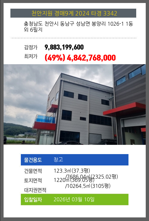 사건번호 2024 타경 3342 본건은 충청남도 천안시 동남구 성남면 봉양리 1026-1 1동외 6필지소재하는 창고경매 물건의 포스팅입니다. 건물면적 [ 전체:123.3㎡ (37.3평) 매각지분:7686.04㎡ (2325.02평) ]토지면적 [ 전체:1220㎡